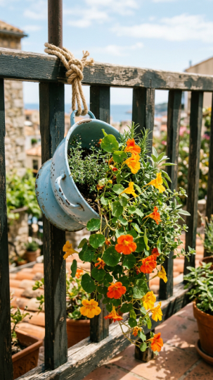 Here’s the deal: a metal colander is basically a perfect hanging planter straight out of the box — it already has drainage holes, a sturdy frame, and a handle to hang from. Grab one from a charity shop, give it a coat of outdoor-grade chalk paint, and you’ve got one of the most charming simple DIY hanging plant ideas for balcony walls going.