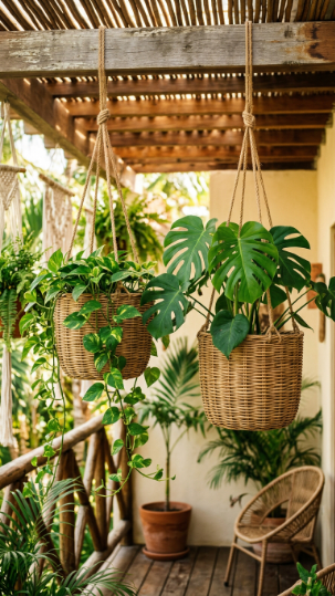 Wicker, rope, and tropical leaves — your balcony just became a resort!