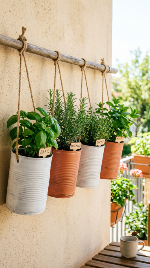 Discover more tin can hanging herb garden ideas for balconies and small spaces.