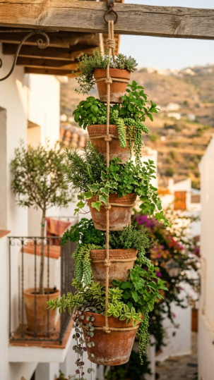 A hanging terracotta pot tower is one of the cleverest and most visually striking of all the simple DIY hanging plant ideas for balcony spaces — it uses vertical space beautifully and the stacked terracotta looks naturally gorgeous.