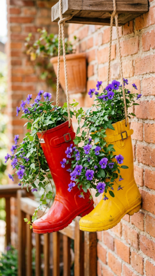 Drill drainage holes in the sole of each boot, then drill a hole through the back upper section and thread a sturdy rope through for hanging. Paint with bright outdoor-grade paint — bold colours look best here; this is not the time for subtlety. Fill with potting mix and plant with trailing violas, ivy, or small flowering annuals.