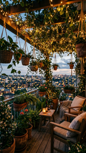 Hang plants at varying heights across the balcony ceiling or beam — trailing pothos, jasmine, and ivy all create a lush canopy overhead. Then weave warm white LED string lights through and between the hanging pots and trailing stems.