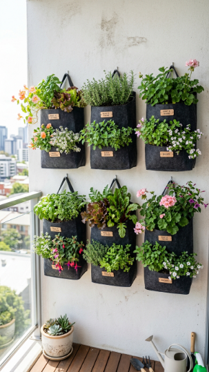 Fabric grow bags hung on a balcony wall are lightweight, flexible, excellent for root health, and incredibly easy to plant up and swap out seasonally. For anyone nervous about weight limits, these are your ideal simple DIY hanging plant ideas for balcony walls.
