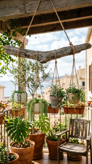 Find a wide, straight-ish piece of driftwood or a fallen branch, sand down any rough patches, and hang it horizontally from your balcony beam with two equal lengths of rope — one at each end. From the branch, hang individual plants at varying lengths using thin twine tied directly to the pots or looped through small macramé hangers.