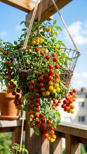Did you know you can grow tomatoes in a hanging basket? Cherry tomato varieties trail and cascade downward beautifully — and having fresh tomatoes dangling from your balcony ceiling is one of the most rewarding things a balcony gardener can experience!