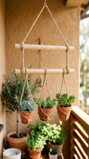 Here’s the deal: a rope and dowel hanging frame is one of the simplest and most stylish DIY projects on this list — it takes about 20 minutes to make, costs almost nothing, and looks like something from a Scandi design boutique. This minimal aesthetic fits beautifully among simple DIY hanging plant ideas for balcony walls.