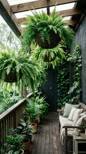Discover more shaded balcony hanging fern and tropical plant ideas here.