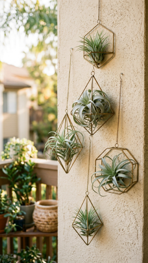 Air plant geometric frames hung as a wall gallery are one of the most modern and artistic of all the simple DIY hanging plant ideas for balcony walls — and they’re insanely lightweight, which makes them ideal for balconies with strict weight restrictions.