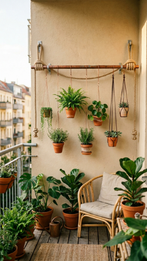 This is a genuinely important safety consideration. Most balcony railings and beams have weight limits specified by the building — check your building’s documentation or ask your building manager before installing multiple heavy displays. As a general guide, use lightweight plastic pots inside decorative containers, choose plastic or fabric hanging baskets over heavy ceramic or terracotta, use perlite-blended compost (lighter than standard potting mix), and never hang directly from a railing without checking it’s rated for the load. When in doubt, go lighter — fabric bags, air plants, and small macramé hangers add almost no meaningful weight.