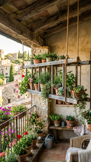 Find a vintage wooden ladder from a secondhand shop, sand it down, and treat with outdoor wood oil or stain. Hang it horizontally from the balcony ceiling or beam using two equal lengths of thick rope or chain — one at each end. Balance pots along the rungs, alternating plant types and pot materials for variety.