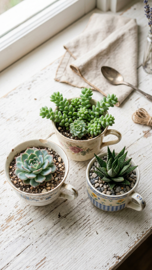 Drill a small drainage hole in the base of each cup (a diamond-tipped bit works perfectly), add a layer of pebbles, then fill with well-draining succulent mix. Group three mismatched cups together for that collected-over-time vibe.