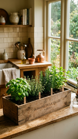 Line a wooden wine crate with burlap or a plastic liner, add potting mix, and plant your favorite kitchen herbs in a neat row. Label each one with small wooden stakes and twine for that rustic farmers’ market feel.