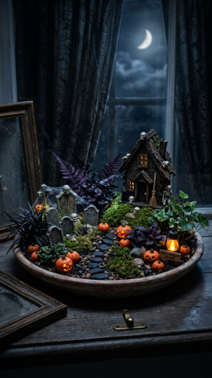 Use a shallow tray or wooden box and fill it with dark potting soil. Plant black mondo grass, mini purple succulents, or deep-colored sedums as your base. Then scatter tiny figurines — witches, ghosts, miniature cauldrons, and faux tombstones — throughout the soil.