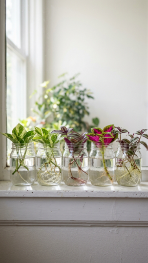 Use different-sized mason jars or glass bottles, fill with fresh water, and pop in cuttings of pothos, wandering dude, or sweet potato vine. Change the water every few days to prevent bacteria buildup.