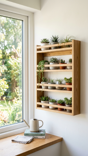 Mount it just above or beside the window, and fill each shelf with small air plants, mini cacti, or trailing plants that spill over the edges. Alternate pot shapes and materials — terracotta, ceramic, and glass — for texture.