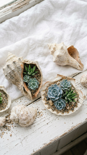 Collect large shells (or grab a bag from a craft store), fill with succulent soil mix, and nestle in tiny rosette succulents. The natural curves of the shell cradle the plant perfectly.