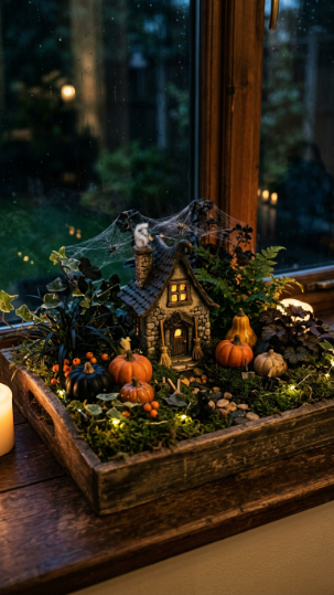 Find a small ceramic or resin cottage at a craft store, place it in the center of a moss-filled tray, then surround it with tiny figurines like broomsticks, black cats, and mini cauldrons. Plant dark sedums or black mondo grass around the cottage for that creepy garden effect.