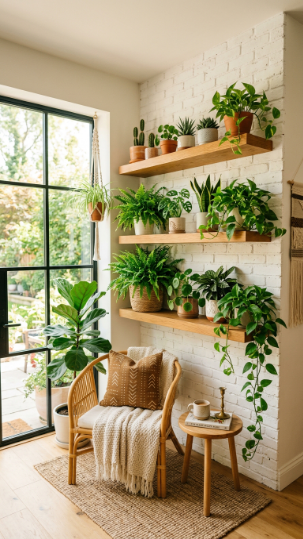 Use natural wood shelves and vary your pot heights and textures — terracotta beside ceramic beside woven baskets creates that curated-but-casual feel. Let trailing plants like pothos or string of pearls drape over the edges for extra drama.