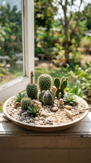 Use a wide, shallow tray and layer the base with coarse sand and decorative pebbles. Arrange cacti in odd-numbered clusters, varying heights from squat barrel cacti to tall columnar ones. Add a few smooth river stones for contrast.
