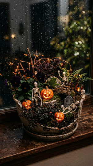String a set of tiny orange LED lights through a shallow tray planted with dark pansies, black mondo grass, and deep burgundy succulents. Nestle mini ceramic jack-o’-lanterns throughout and add tiny skeleton figurines for extra drama.