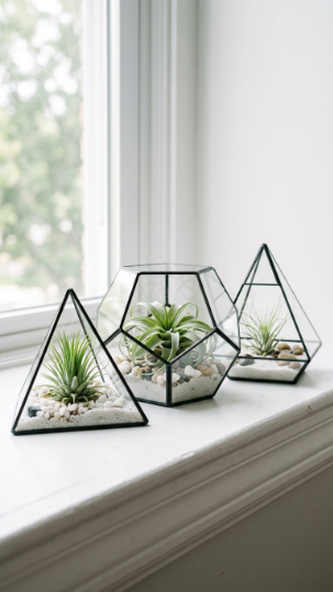 Air plants (tillandsia) are basically the unicorns of the plant world — no soil needed, minimal care, and they look absolutely stunning in geometric glass terrariums. This is a perfect DIY plant decor for windowsills idea for minimalist or modern spaces.