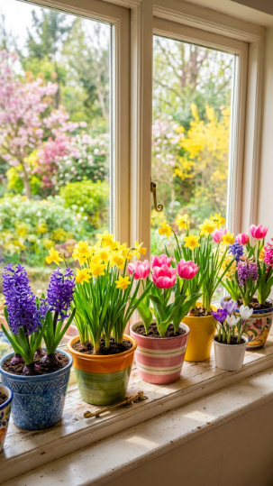Plant hyacinth, daffodil, or tulip bulbs in individual pots in autumn, give them a cold period in the garage or fridge for 8–10 weeks, then bring them to a sunny windowsill to bloom. Time them so you have a rolling display of colour from January through April.