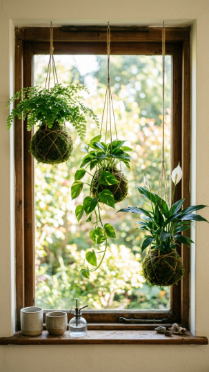 Kokedama is a Japanese art form where plants grow in a ball of moss instead of a pot — and when you hang several at different heights in front of a window, the effect is absolutely breathtaking. This is the most unique DIY plant decor for windowsills on this whole list!