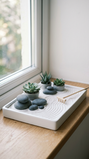 A miniature zen garden on your windowsill is the ultimate stress-reliever — raking the sand is surprisingly therapeutic, and the combination of smooth stones and architectural succulents looks incredibly elegant.