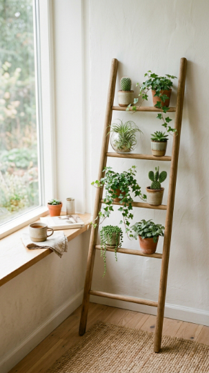 Use each rung to display a mix of plant heights and textures — trailing plants on the top rungs to cascade downward, with sturdier mid-size plants on the lower rungs. Weave fairy lights through the rungs for evening ambiance.