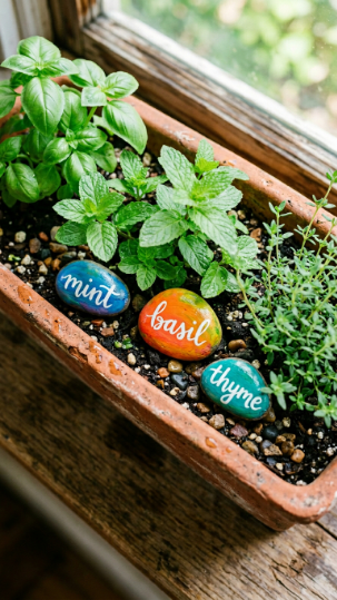 Find smooth flat rocks, paint them with chalk paint or acrylic, and write your herb names in a fun font. Seal with waterproof varnish so they survive watering. You can also paint tiny little illustrations — a rosemary sprig on the rosemary rock, a mint leaf on the mint rock.