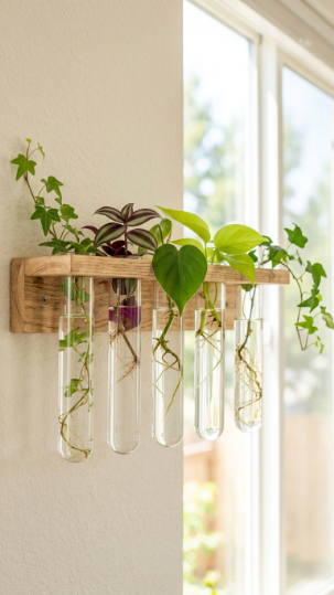 Mount a wooden test tube holder (easy to DIY or find online) at the window, fill glass test tubes with water, and insert a variety of plant cuttings. The clear glass shows off the roots as they develop, turning the whole thing into a living piece of art.