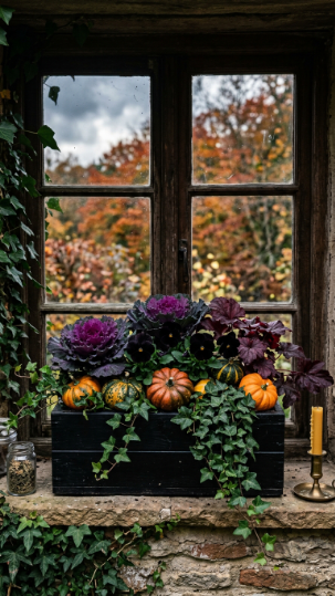 Fill a dark window box with ornamental kale, black pansies, heuchera ‘Obsidian’, and trailing ivy. Add miniature pumpkins, dried seed pods, and a few sprigs of dried lavender or blackberries for texture.