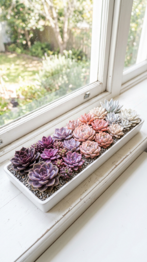 Save the best for last! An ombre succulent tray is probably the most visually stunning DIY plant decor for windowsills you can create — it’s a rainbow of rosettes that genuinely looks like professional florist work.