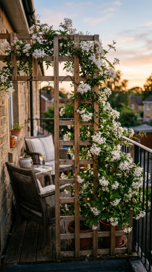 Build a simple wooden trellis from 2.5cm square timber batten in a grid pattern at 20cm intervals, screwed together at each intersection. Fix to the interior face of the balcony railing using cable ties, hooks, or screws (check your tenancy agreement before drilling). Plant Jasminum officinale (common white jasmine) in a large 30–40 litre container at the base, using a loam-based John Innes No. 3 compost for stability and moisture retention.