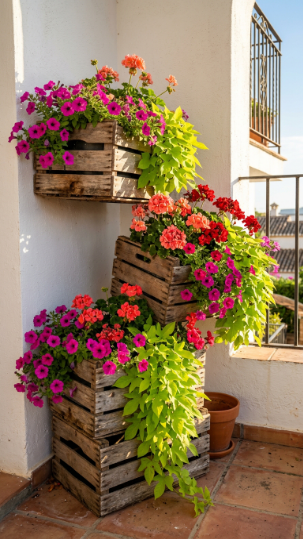 Line each crate with a double layer of hessian fabric before filling with compost — this retains soil while allowing adequate drainage. Plant trailing varieties that will cascade over the edges: Petunia surfinia, Lobelia erinus (trailing), and Ipomoea batatas (sweet potato vine) in chartreuse or purple create a spectacular cascading effect in full sun.