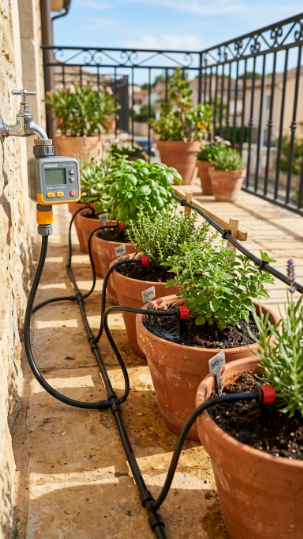 Programme the timer to water for 10–15 minutes each morning, ideally between 6–8am when evaporation rates are lowest. For pots in full sun during summer, set a second short cycle of 5 minutes in early evening. Use a flow regulator to ensure even pressure across all emitters, particularly if your balcony has several pots at different heights.