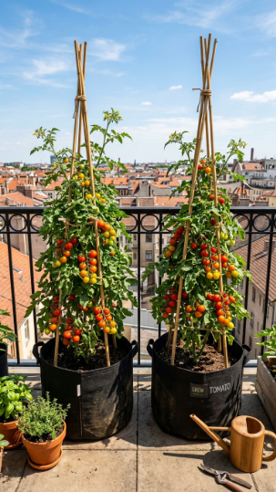 Cherry tomatoes in grow bags are the most productive food-growing project for any balcony oasis — a single south-facing balcony can realistically yield 2–4kg of fruit per plant from June through September.
