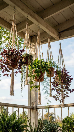 A tiered collection of macramé planters creates the kind of lush, layered balcony atmosphere that photographs look like they took months to achieve.