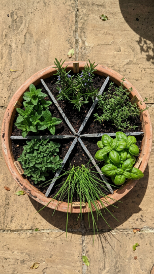 Plant one herb per section: Rosmarinus officinalis (rosemary), Thymus vulgaris (common thyme), Ocimum basilicum (basil), Allium schoenoprasum (chives), Origanum vulgare (oregano), and Mentha spicata (spearmint). Critically, plant mint in its own pot-within-a-pot: sink a 10cm plastic pot into the mint section and plant into that — mint’s rhizomes will overtake the entire container otherwise.