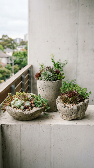 Hypertufa planters — made from perlite, peat-free compost, and Portland cement — look like aged stone but weigh a fraction of concrete, making them ideal for weight-conscious balcony gardens.