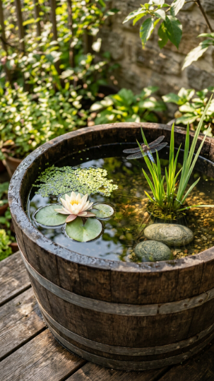 A miniature pond in a half-barrel is perhaps the most surprising DIY project to create a balcony oasis — it introduces an entirely new ecosystem to an urban outdoor space in a single afternoon.