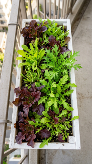 Salad leaves tolerate partial shade better than most balcony crops — an east or west-facing balcony with 3–4 hours of direct sun produces excellent results. In hot summer weather, provide afternoon shade to prevent bolting (premature flowering and bitter flavour).