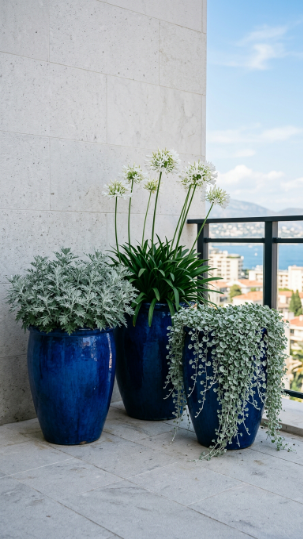 - Midnight blue pots + white agapanthus + silver dichondra