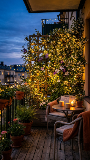 Fairy lights in climbing plants is the single after-dark transformation that will make your balcony feel like a different place entirely.