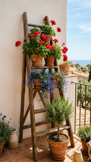 A ladder stand is proof that the most characterful balcony displays come from the least expected places.