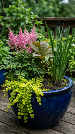 Plant bog-loving species: Astilbe ‘Fanal’ (deep red feathery plumes, 60cm), Lysimachia nummularia ‘Aurea’ (golden creeping Jenny, trails beautifully over the pot edge), Iris ensata (Japanese water iris, architectural foliage and violet flowers), and Rodgersia pinnata ‘Superba’ (bold textured leaves). Water generously every 2–3 days in summer — the goal is consistently moist, never dry, compost.