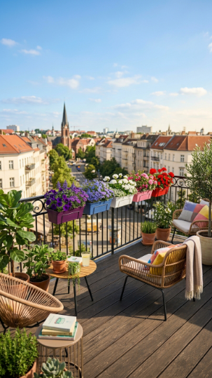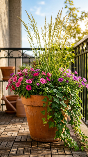 Far fewer than most people think — and this is the insight that changes everything. Three large, well-planted containers in a considered arrangement make a far greater visual impact than fifteen small scattered pots. A single large thriller-filler-spiller container in the corner, two generous railing boxes, and one hanging basket can genuinely transform a small balcony from bare to beautiful. Concentrate your budget on fewer, larger containers planted generously rather than spreading it across many small pots that individually lack the visual weight to make a real impact.