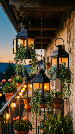 Repurposed lanterns as hanging planters are one of the most atmospheric and romantic balcony plant arrangement ideas on this entire list. Remove the candle holder, line the base with a small plastic saucer, and fill with a compact trailing plant — string of pearls, mini ivy, or a single trailing succulent — and suddenly functional outdoor lighting becomes living botanical art.
