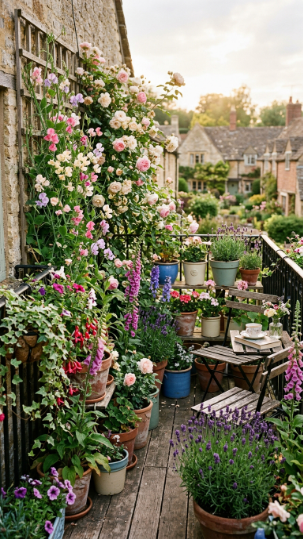 The cottage garden aesthetic is all about beautiful, organized chaos — a riot of color, texture, and fragrance that looks effortlessly natural and romantically abundant. On a balcony, this translates to mismatched terracotta pots, climbing sweet peas on a small trellis, compact lavender, and miniature roses all growing together in deliberate but seemingly accidental profusion.