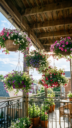 Filling your balcony ceiling with hanging baskets at staggered heights creates an overhead garden canopy that completely transforms the feeling of your outdoor space — suddenly you’re sitting inside a garden rather than beside one. It’s immersive, abundant, and genuinely magical.